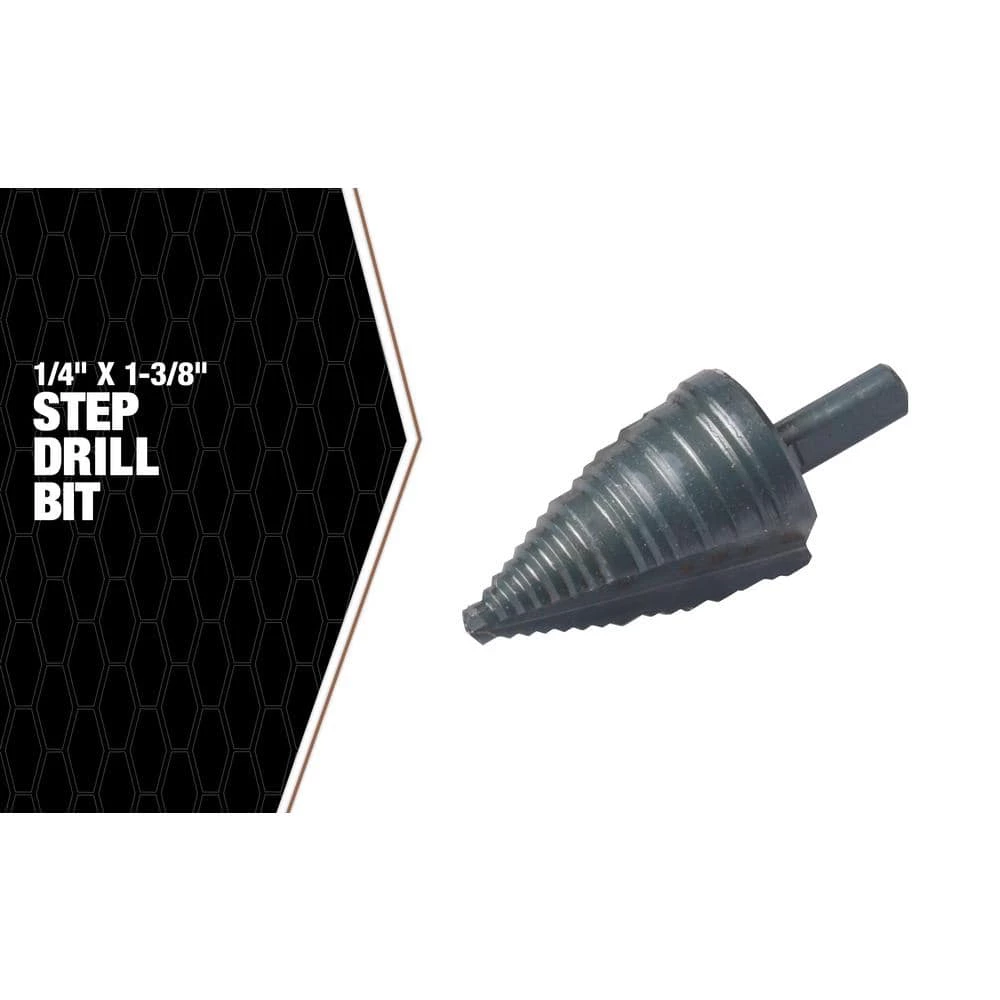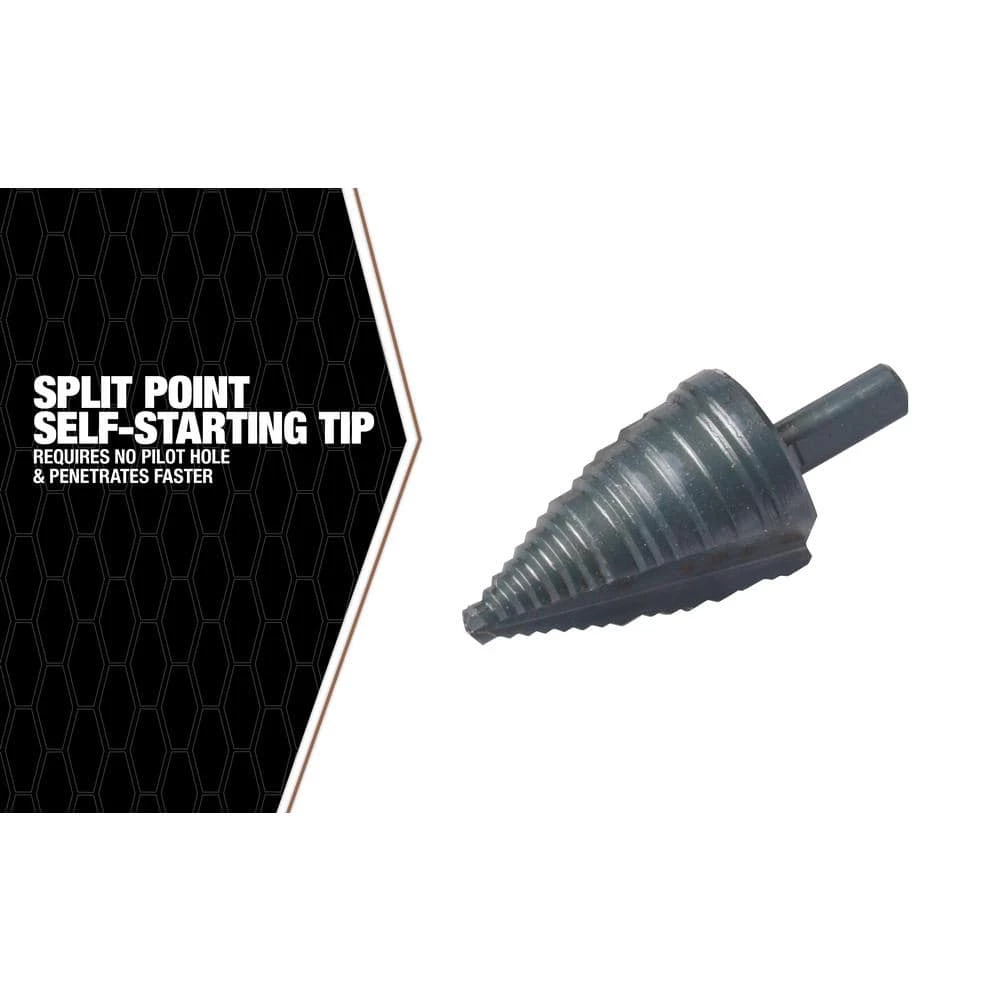 The SB1/4-1-3/8 Step Drill Bit is a heavy-duty bit used for high-quality drilling. With its split point, self-starting tip, this bit is great for quickly and cleaning drilling holes in metal, wood or plastic.