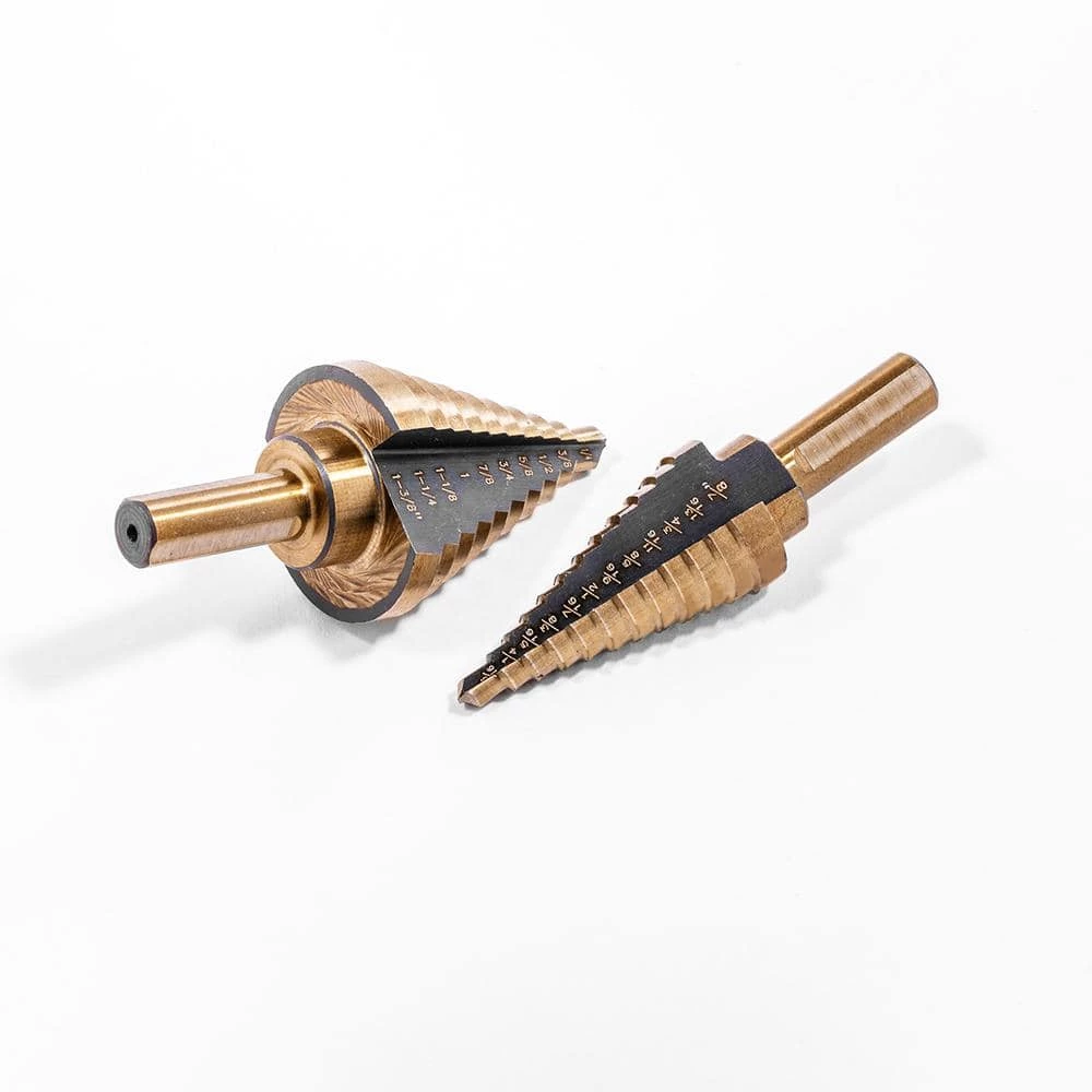5-piece Step drill bits are constructed from traditional HSS combined with a titanium coating to make them even more durable. This also proves the capability and durability of the drill to last through multiple drilling on surfaces such as: plastic, aluminum, copper, stainless steel and so much more. Features a 3-sided shank to prevent slip in the drill chuck and bits automatically deburrs holes as you drill. Comes with storage.