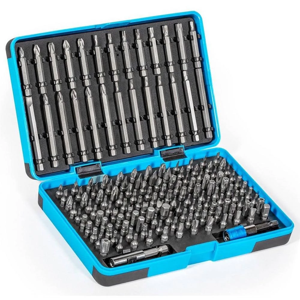 - 70-pieces – 25 mm bits: 12 slot: 2 mm, 2.5 mm, 3 mm, 3.5 mm, 4 mm, 4.5 mm, 5 mm, 5.5 mm, 6 mm, 6.6 mm, 7 mm, 8 mm, eight Phillips: #00, #0, #1, #2, #2, #3, #4 eight pozi: #00, #0, #1, #2, #2, #3, #4, twelve hex: 1.5 mm, 2 mm, 2.5 mm, 3 mm, 3.5 mm, 4 mm, 4.5 mm, 5 mm, 5.5 mm, 6 mm, 7 mm, 8 mm, 10 hex: 1/16 in., 5/64 in., 3/32 in., 7/64 in., 1/8 in., 9/64 in., 5/32 in., 3/16 in., 7/32 in., 1/4 in., thirteen TORX: T5, T6, T7, T8, T9, T10, T15, T20, T25, T27, T30, T40, T45, 3 spline: M5, M6, M8, 4 Robertson: 0, 1, 2, 3