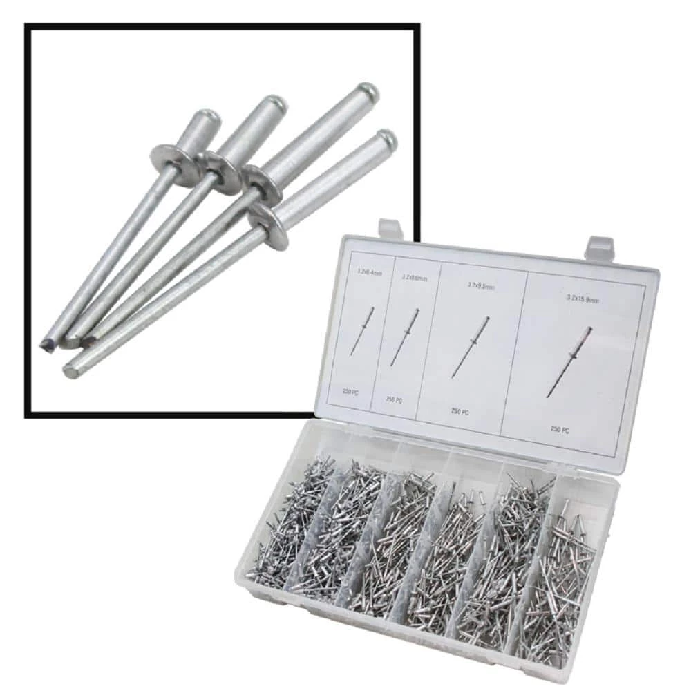 - 250-piece of each: 1/8 in. x 1/4 in., 1/8 in. x 5/16 in., 1/8 in. x 3/8 in., 1/8 in. x 5/8 in. rivets