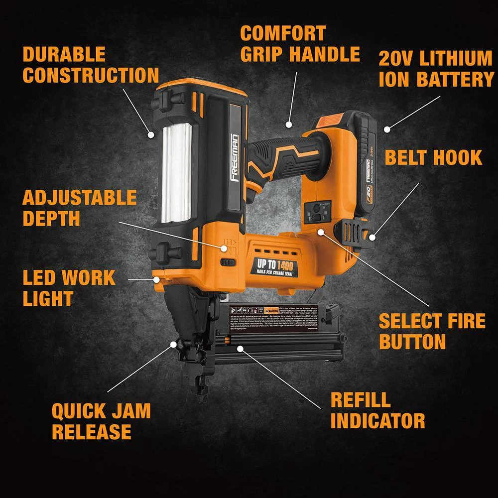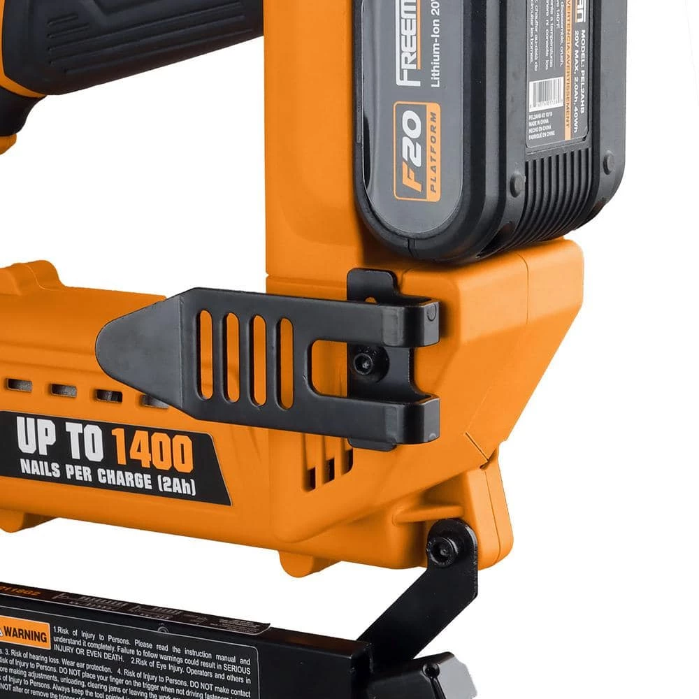 The Freeman PE20V2118G2 20-Volt Cordless 2-in-1 18-Gauge Nailer/Stapler Kit with Lithium Ion Battery, Charger, Bag and Nails (400-Count) can drive up to 1400 fasteners per charge and 90-pieces per minute and is powered by a high-capacity rechargeable 20-Volt 2.0 Ah lithium-ion battery. The cordless electric design eliminates the need to be tethered to a loud and heavy air compressor, improving mobility around the house or jobsite. A 2-in-1 multi-purpose magazine allows both nailing and stapling with just one tool and is ideal for decorative trim, moulding, cabinetry, paneling, upholstery, insulation, plastic sheeting, window casing, furniture trim, picture frame assembly and hobbies and crafts. Use the select fire button to toggle between single sequential firing or bump firing. The depth of the fasteners is adjusted by turning a wheel near the drive blade and a quick jam release provides easy access clearing in the event of a jammed fastener. A no mar tip protects your work surface, ensuring professional results for DIYers as well as construction contractors. This cordless finish nailer comes with everything you need to get right to work, including a 20-Volt 2.0 Ah lithium-ion battery, rapid charger, canvas bag, belt hook and fasteners. The 20-Volt Cordless 2-in-1 18-Gauge Nailer/Stapler Kit will significantly increase your productivity when tackling home improvement and repair projects and is covered by Freeman’s 1-Year Professional Tool Warranty.