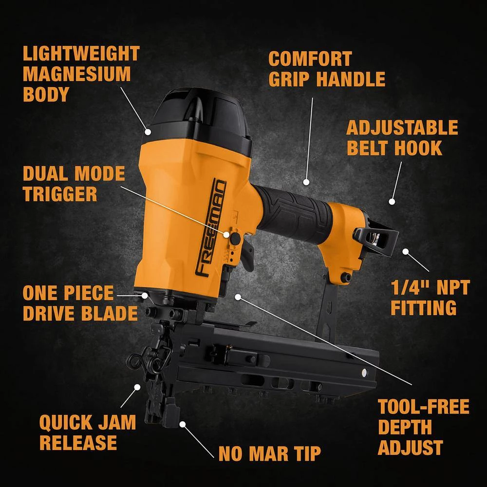 Freeman’s all-new 2nd Generation 10.5-Gauge 1-9/16 in. Fencing Stapler has been redesigned with contractors’ in mind. Re-engineered internal components, top of the line features, and enhanced driving power make this fencing stapler more powerful and reliable than ever. Compatible with 10.5-Gauge glue collated fencing staples from 7/8 in. to 1-9/16 in., this pneumatic stapler delivers high-quality performance for your next hog and cattle fencing, pet enclosure, deer prevention, vineyard trellising, snow control fencing, electrified single wire with insulation, and other mesh and woven projects. Lightweight and resistant to damage, this nailer stands up to the toughest jobs thanks to the magnesium body, one-piece hardened steel drive blade, and scratch-resistant powder coating. Optimized airflow and upgraded internal parts provide increased power with less air consumption, while also allowing for quick and easy repairs. Designed for maximum comfort and ease of use, this stapler features an updated grip, adjustable metal belt hook, wire-alignment notch to for accuracy, select fire trigger to easily switch between bump and sequential modes, easily adjustable depth for various applications, and a quick release nose for easy jam clearing. The Freeman 2nd Generation 10.5-Gauge 1-9/16 in. Fencing Stapler is backed by an industry-leading 7-year Professional Warranty and 90-day Wearable Parts Warranty, and comes with a 1/4 in. NPT connector, air tool oil, and adjustment tools.