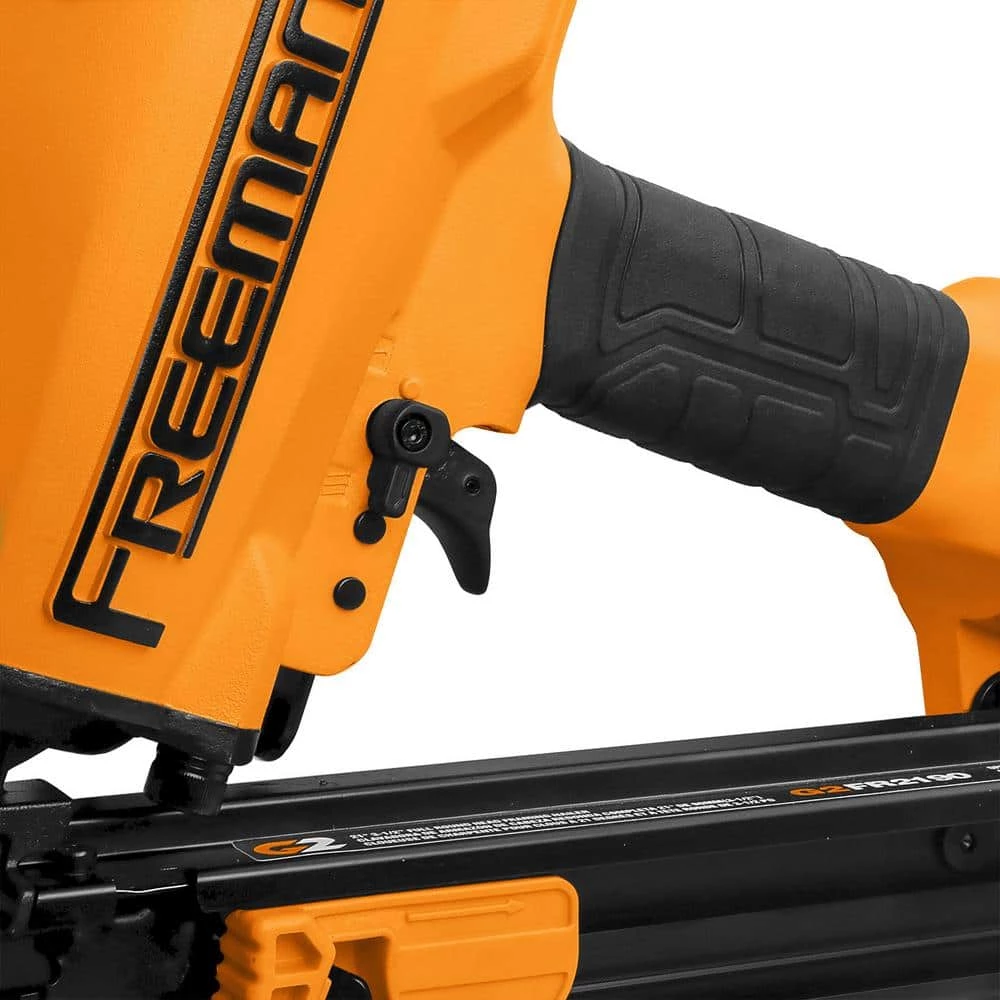 Freeman’s all-new 2nd Generation Pneumatic 21 Degree Framing Nailer has been completely redesigned with contractors’ needs in mind. Re-engineered internal components, top of the line features, and enhanced driving power make this framing nailer more powerful and reliable than ever before. This air powered nail gun delivers high-quality performance for your next framing, subfloor, roof decking, pallet and shipping crate assembly, and wood fencing projects. Optimized airflow and upgraded internal parts provide increased power with less air consumption, while also allowing for quick and easy repairs. Designed for maximum comfort and control, other features include a select fire trigger, an anti-dry fire mechanism, tool-free depth of drive, an updated textured grip, a removable no-mar tip covering aggressive teeth for precise toe nailing, and an adjustable metal belt hook. The Freeman 2nd Generation Pneumatic 21 Degree Framing Nailer is backed by an industry-leading 7 Year Professional Warranty and 90 Day Wearable Parts Warranty, and comes with a 1/4 in. NPT connector, air tool oil, and adjustment tools.