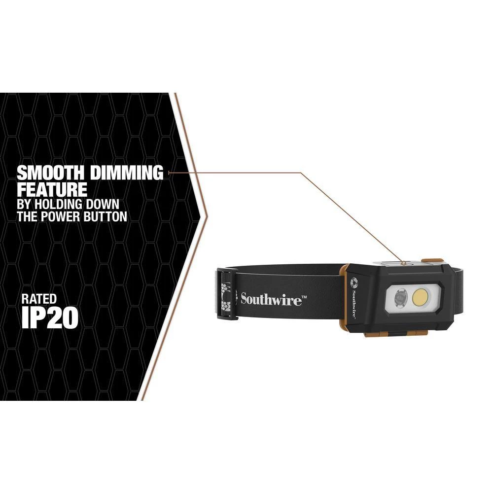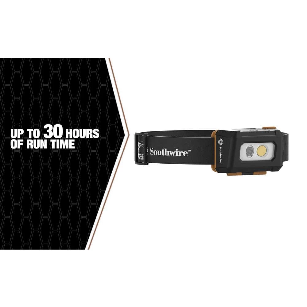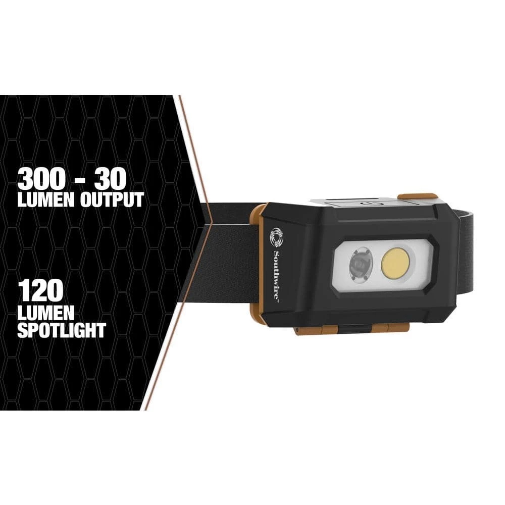 The HL1030SW Southwire 300 Lumens LED Headlamp features a 30 Lumens-300 Lumens flood light and 120 Lumens spot light. With a smooth dimming function, simply hold the power button down to switch between high and low output modes. The HL1030SW Headlamp utilizes 3-AAA Alkaline batteries (included) to deliver up to 30-hours of runtime. Package includes a Southwire adjustable elastic headstrap. Rated IP20, this light is built to withstand the elements.