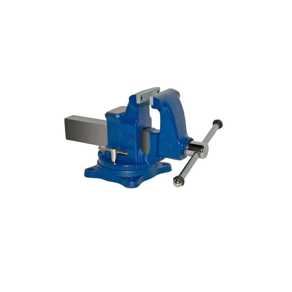 These heavy-duty vises meet Federal Specifications GGG-V-410, TYPE VI, CLASS 2. Each vise casting is constructed in 65,000 psi tensile ductile iron. The large pounding anvil surface and deep throat allow for extra working room. The interlocking swivel base with 360 degree motion is equipped with 2 lockdowns. A continuous rolled thread on main screw features a no pinch main screw handle. The serrated jaws are replaceable hardened steel.