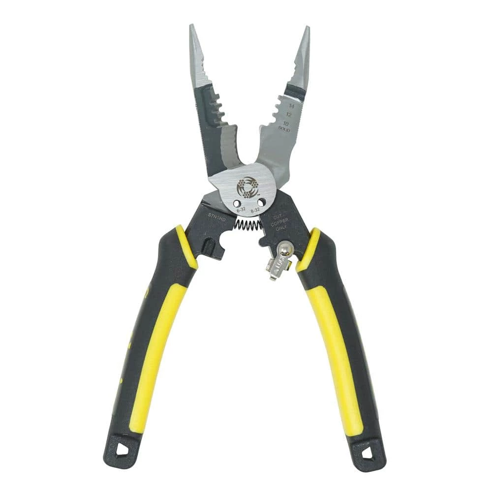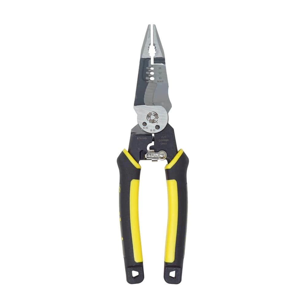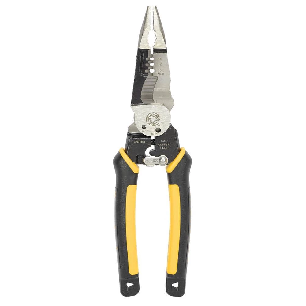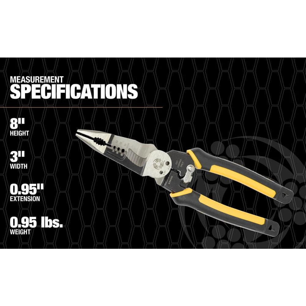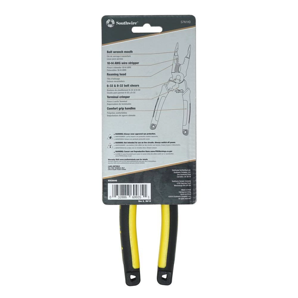 The 7-IN-1 multi-tool pliers are perfect for stripping, shearing, gripping, crimping, reaming, and spanning and shearing bolts. The scalloped blade cuts easily and efficiently These multi-tool pliers come with tether ready handles for drop prevention.