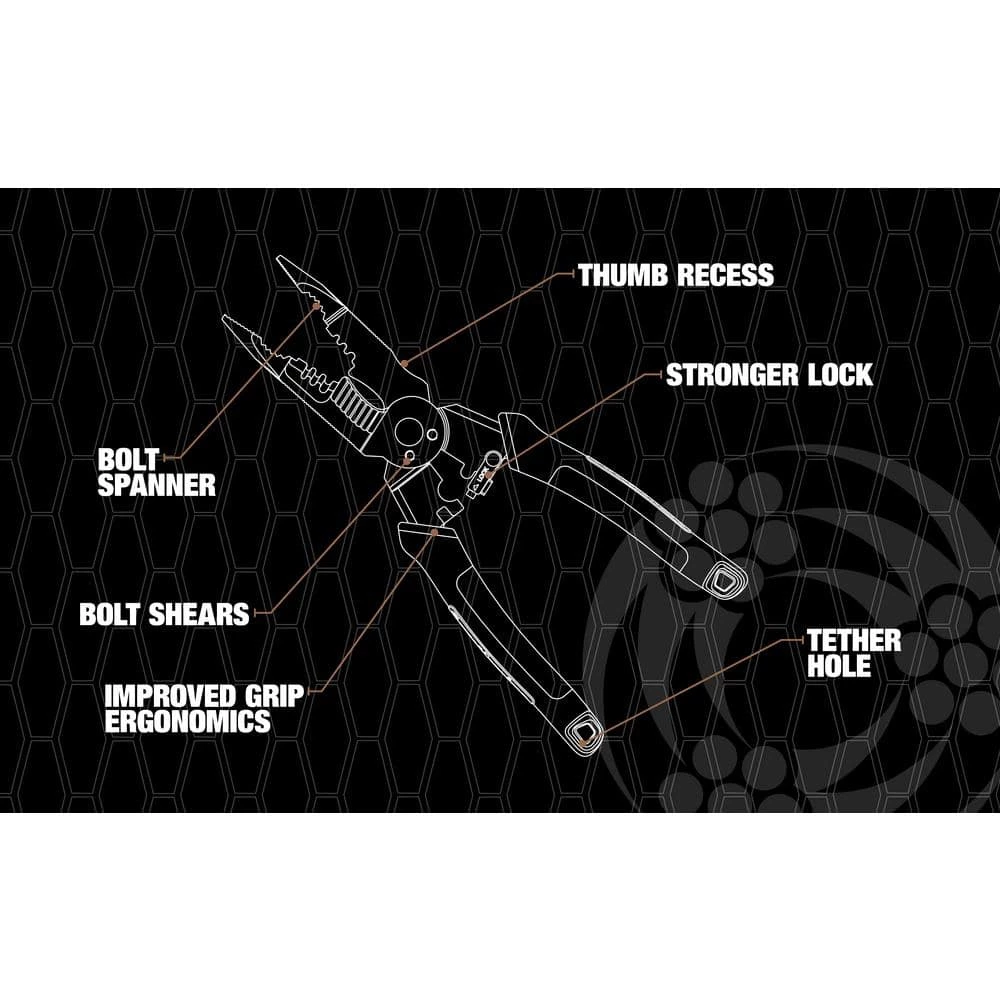 - 7-in-1: shears, grips, wire stripper, bolt spanner, bolt shears, crimper, reamer