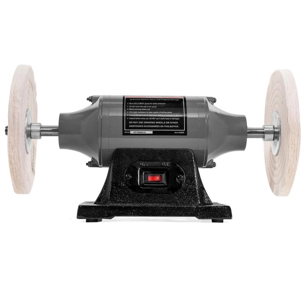 Machine is designed for polishing off your project at the last step. The buffer motor helps you with the final touches by working in low vibration as it features full copper windings with tight bearing tolerances. Smooth and polish metal, plastic and other materials with this heavy-duty 1 HP buffer. The rugged cast iron base reduces vibration so that you have a smooth, easy-to use buffing station for all your projects. Extra-long, ball bearing supported precision machine shafts for durable performance.