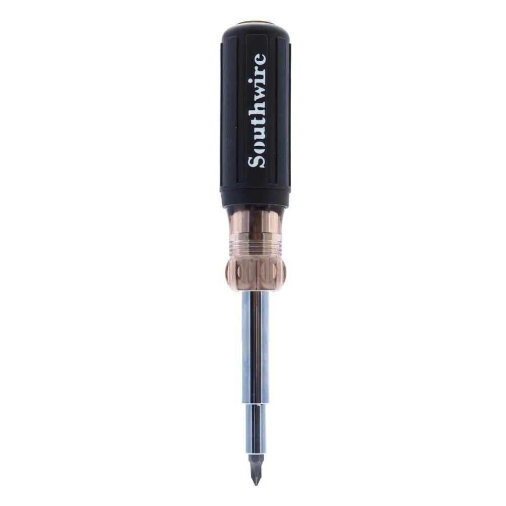 Interchangeable screwdriver with 3/16 in., 1/4 in. Slotted; #1, #2 Phillips; #1,#2 Square Recessed; and, 1/4 in., 5/16 in., 3/8 in. Hex Driver. Southwire’s 9-N-1 Multi-tool Screwdriver provides ample force to get the job done. Six bit sizes and 3 nut driver sizes will help you work quickly and efficiently without overloading your tool pouch.