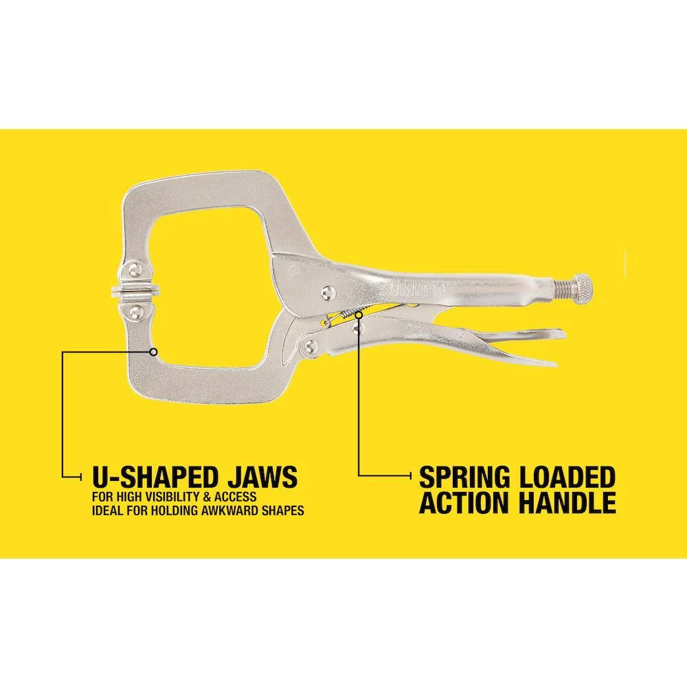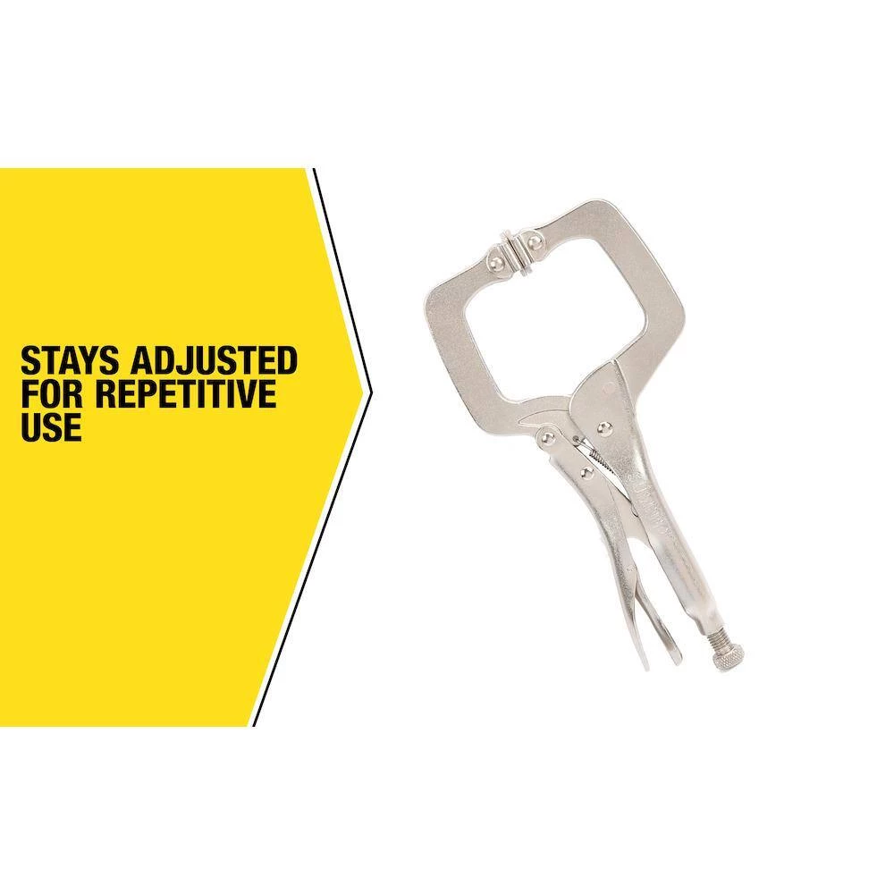 The 9 in. Locking Clamp with Swivel Pads is designed for adaptable use on the job. It features 4 different locking clamp sizes 6”, 9”, 11” and 18”. The strong, riveted connecting arms prevent its joint integrity from being compromised. Features swivel pads that provide a more stable gripping surface to hold your work securely. Additionally, the trigger release delivers a maximum locking force every time.