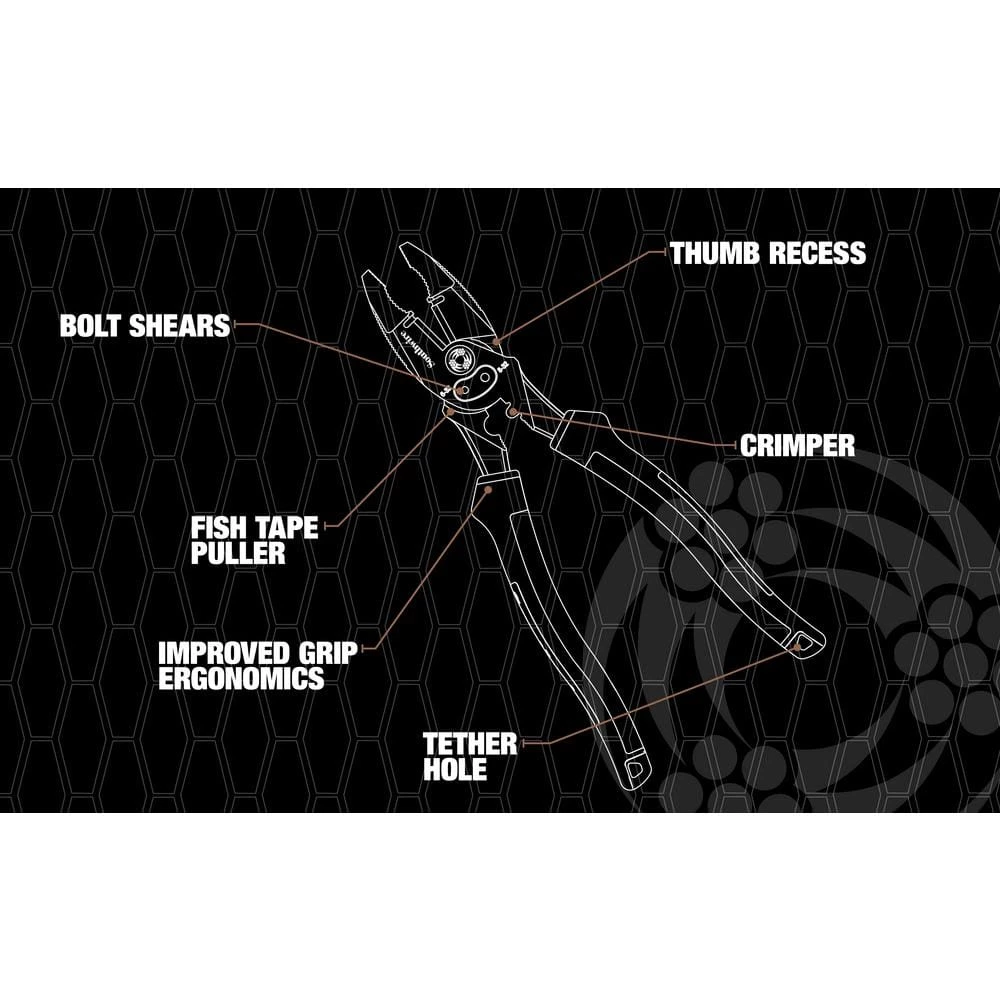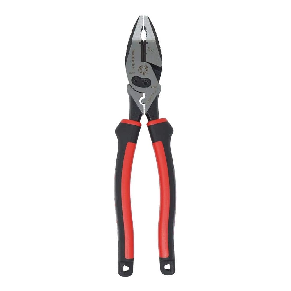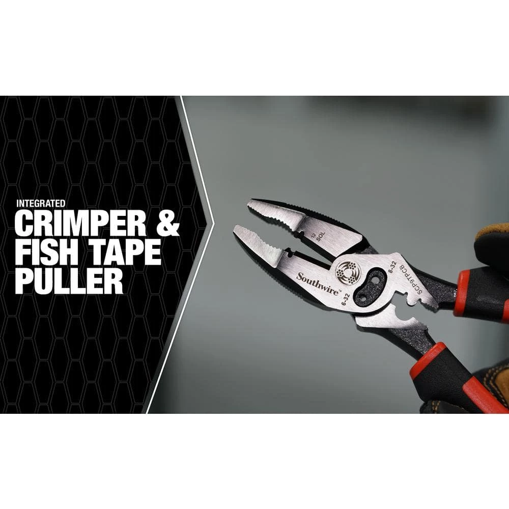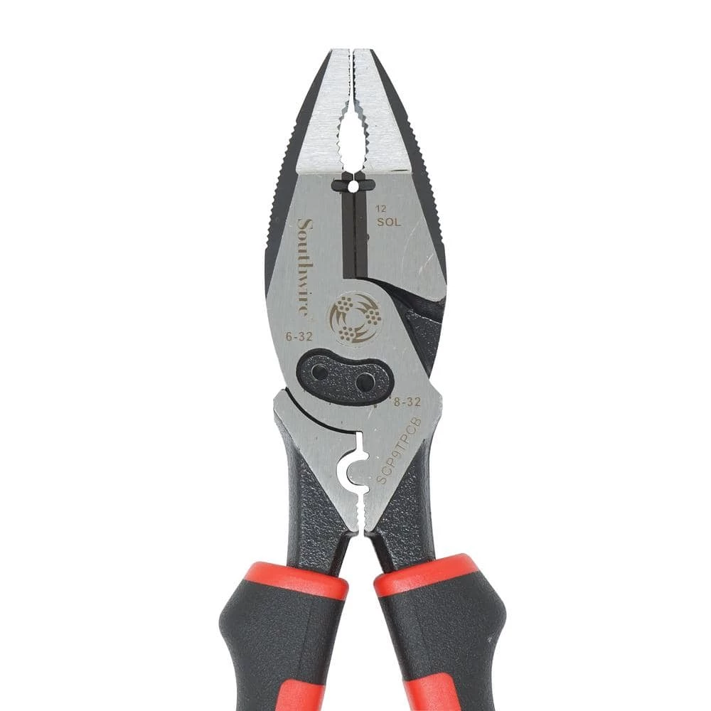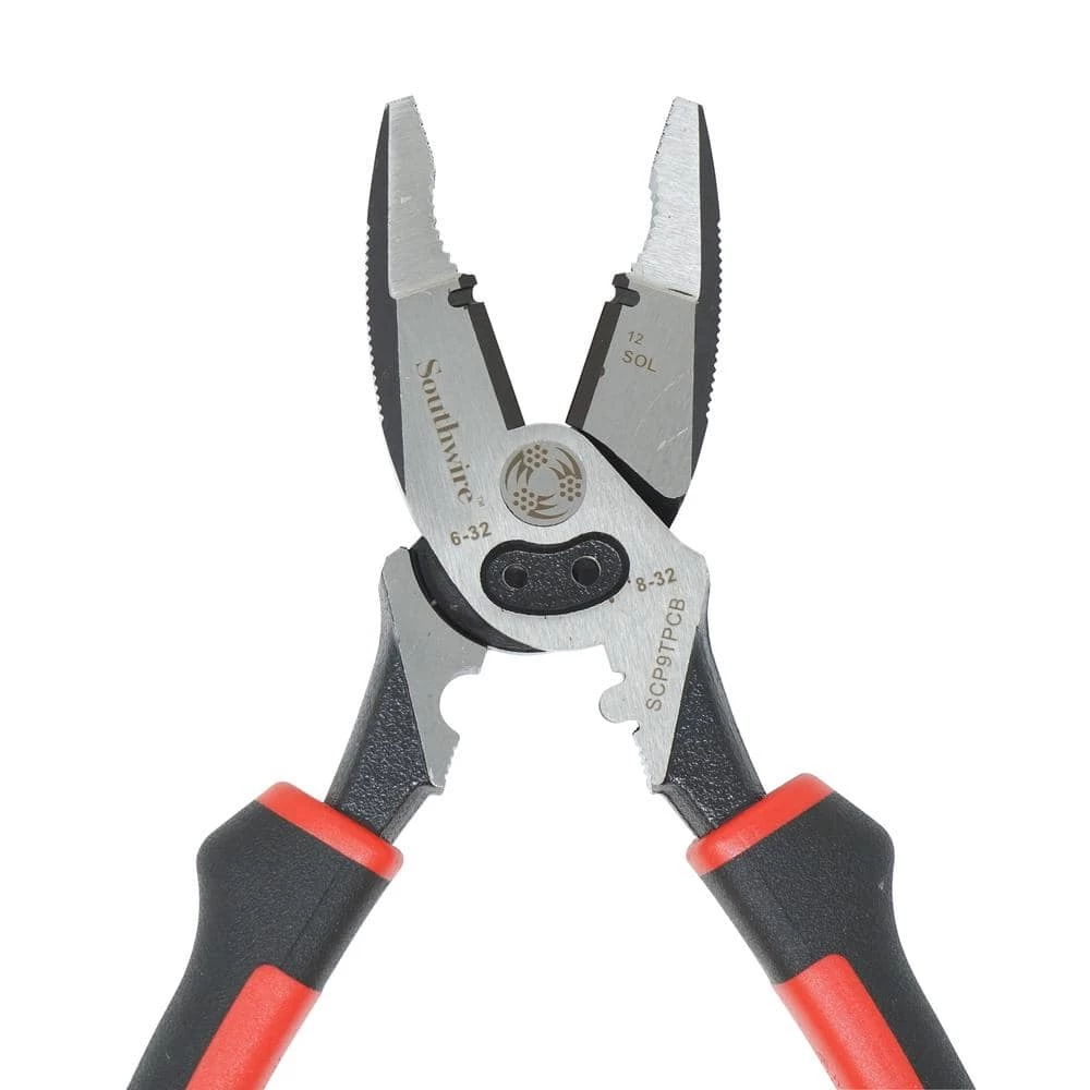 Southwire SCP9TPCB Side Cutting Combination Pliers combine Heavy-duty forged steel and fire rivet technology, made to get the job done. The Fire Rivet construction delivers smooth action with no wobble, and cuts clean every time. The SCP9TPCB comes with tether ready handles for drop prevention. It is multi-functional as a reamer, cutter, stripper, fish tape puller, crimper, bolt shear, spanner wrench, or grip. Shears: 6-32 and 8-32 bolt. Strips: 12 AWG Sol wire convenient integrated crimper and fish tape puller.