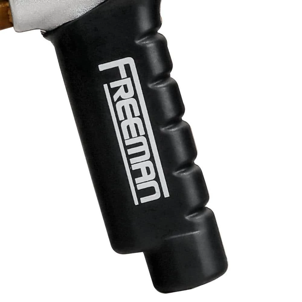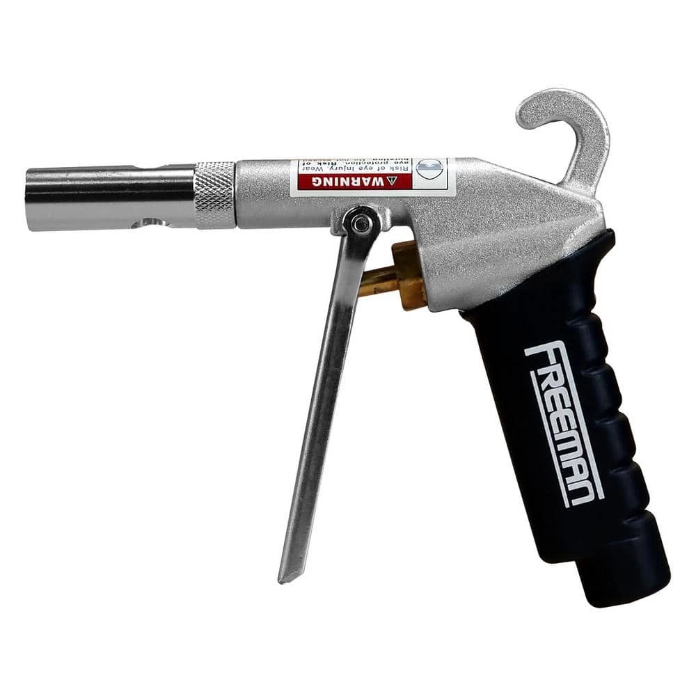 The Freeman PHFBG High Flow Blow Gun with Venturi Nozzle provides more air flow than standard air guns and is perfect for cleaning out hoses, pipes, clogged lines and gutters and for moving large amounts of debris. This rugged air powered tool is built to last with durable and lightweight aluminum construction and a comfortable pistol grip reduces fatigue while increasing control. The high performance variable flow trigger precisely controls air flow from the Venturi nozzle attachment, designed to fit into tight spaces. The High Flow Blow Gun with Venturi Nozzle connects to air hoses with 1/4 in. NPT threads and makes fast and easy work of surface preparation or heavy duty clean-up projects around the garage, workshop, home and jobsite.