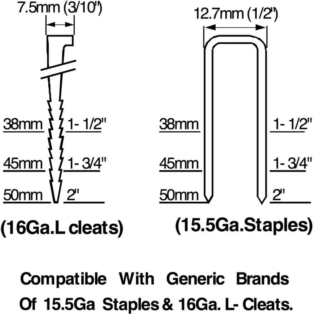 - Compatible with 16-Gauge L-cleats from 1-1/2 in. to 2 in., and 15.5-Gauge 1/2 in. crown staples from 1-1/2 in. to 2 in.