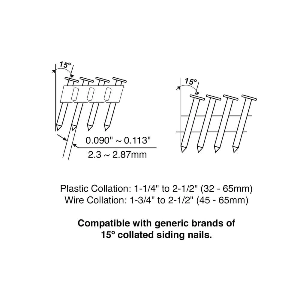 - Compatible Nails: 15 degree plastic collated coil siding nails from 1-1/4 in. – 2-1/2 in., and 15 degree wire collated coil siding nails from 1-3/4 in. – 2-1/2 in. (0.09 in. – 0.113 in. diameter)