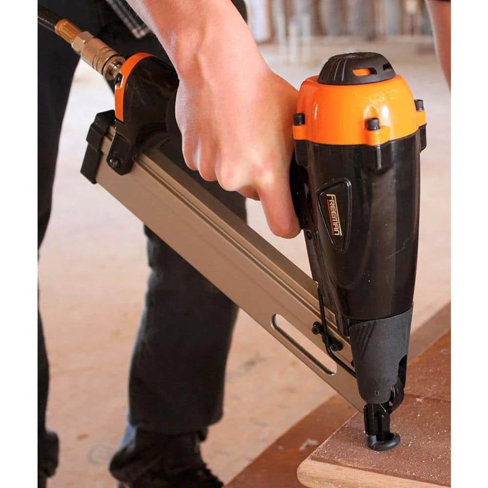 Top off your projects with Freeman PFN1564 Pneumatic 15-Gauge 34° Angle 2-1/2 in. Finish Nailer with Case. Use it to install door and window casing, moulding, trim, chair rails, cabinetry and other fine finish applications. This air powered nail gun is compatible with 15-Gauge tape or glue collated 34° finish nails from 1-1/4 in. to 2-1/2 in. Convenient and time saving features include a tool-free quick jam release nose for fast and easy nail extraction should a nail jam during use, a dual mode trigger for switching between sequential or bump firing, and a comfort grip handle to reduce fatigue and increase control. The depth of the nails is easily adjustable for various applications by simply turning a wheel near the trigger. The 34° angle of the magazine allows the user to reach into corners or tight spaces with ease. This durable finish nailer is a must-have for DIYers taking on home improvement and repair projects, as well as professional construction contractors at the job site. The Pneumatic 15-Gauge 34° Angle 2-1/2 in. Finish Nailer includes a blow molded carry case, belt hook, safety goggles, air tool oil, and adjustment tools, and is covered by Freeman’s 7-Year Limited Warranty and 90-day Wearable Parts Warranty.