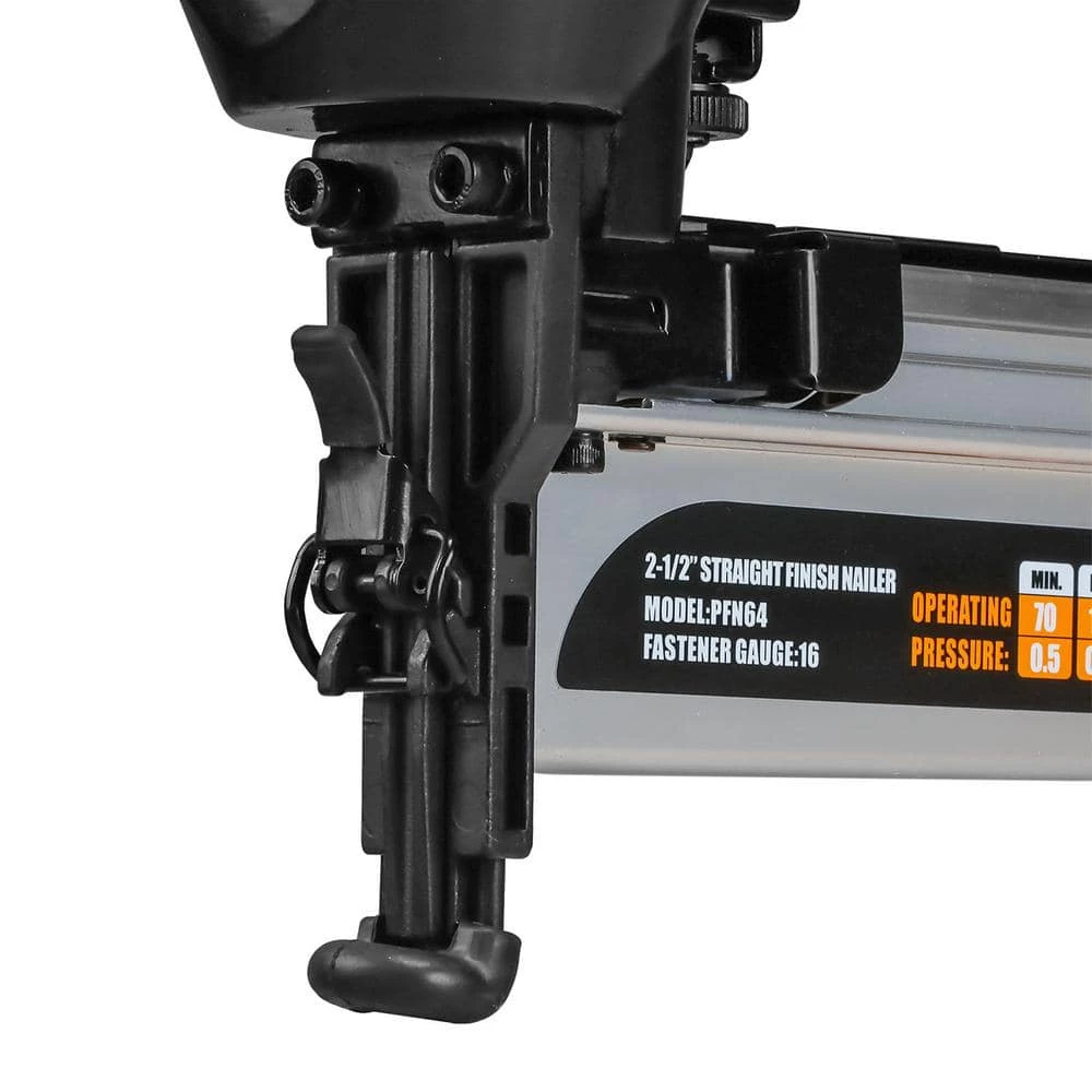 The Freeman PFN64 Pneumatic 16-Gauge 2-1/2 in. Straight Finish Nailer is ideal for applications such as base moulding, crown moulding, furniture construction, chair rails, door and window casing, and cabinetry. This air powered nail gun is compatible with 16-Gauge straight finish nails from 1 in. to 2-1/2 in., and contains a quick release nose for fast and easy access clearing in the event of jammed fasteners. Other convenient features include a tool-free finger depth adjust for various applications, and a no mar safety contact to prevent damage to your surface during finish work. The magazine and cylinder of this nailer are constructed of anodized aluminum for lightweight durability, and the Teflon O-rings and 1-piece drive blade also work to extend the life of the tool. The ergonomically designed die cast aluminum body results in a lightweight and rugged tool great for use over long shifts, and the comfort grip handle reduces fatigue while increasing control and accuracy. This nail gun will allow you to tackle finish work quickly and easily whether you are a DIYer working on home improvement and repair projects or a professional contractor at the job site. The Pneumatic 16-Gauge 2-1/2 in. Straight Finish Nailer includes a belt hook, safety goggles, air tool oil, and adjustment tools, and is covered by Freeman’s 7-Year Limited Warranty and 90-day Wearable Parts Warranty.
