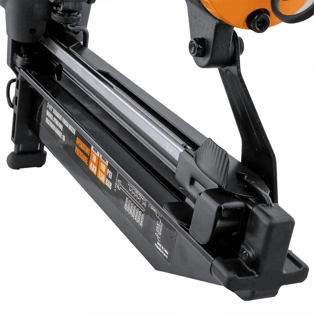 The Freeman PFN64NQ Pneumatic 16-Gauge 2-1/2 in. Straight Finish Nailer with Nails (200 count) is great for tackling projects such as base molding, crown molding, chair rails, door and window casing, furniture construction and cabinetry. This air powered nail gun is compatible with 16-Gauge straight finish nails from 1 in. to 2-1/2 in. A die cast aluminum body and a 1-piece drive blade of heat treated steel result in a lightweight and durable tool excellent to use for long stretches of time. Featuring a tool-free depth adjust for various applications and a quick jam release for easy access to the drive blade in the event of a jammed fastener, this finish nailer will significantly increase your productivity around the home or job site. The comfort grip handle reduces fatigue and increases control during operation and the 360° adjustable exhaust allows you to direct air away from your face. A no mar safety tip prevents damage to your working surface and ensures professional results for DIYers as well as construction contractors. The Pneumatic 16-Gauge 2-1/2 in. Straight Finish Nailer includes 200 nails to get you right to work and is covered by Freeman’s 2-year Professional Tool Warranty and 90-day Wearable Parts Warranty.