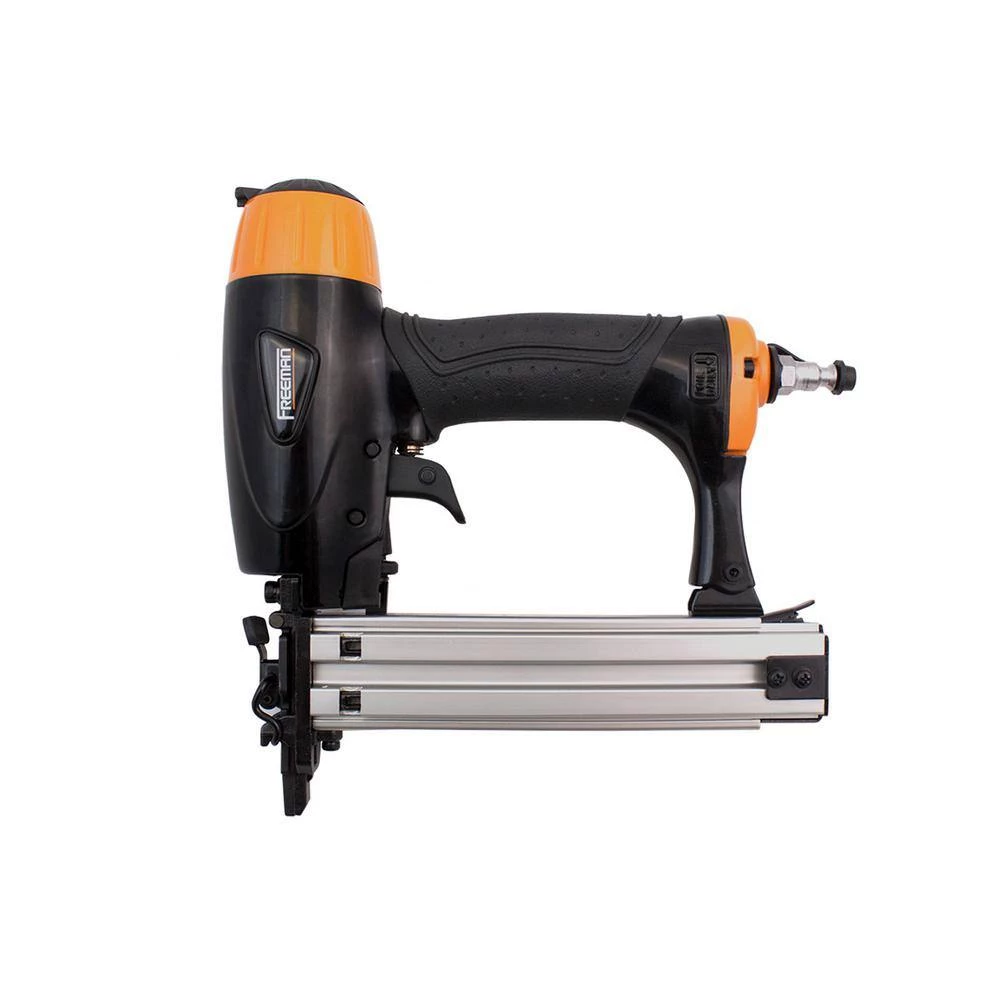 The Freeman PF20GLCN Pneumatic 20-Gauge 1-1/4 in. L-Cleat Flooring Nailer is ideal for installing 5/16 in. to 9/16 in. solid or engineered tongue and groove flooring, including all types of bamboo and exotic hardwoods. This air powered mini flooring nailer drives 20-Gauge L-cleats from 1 in. to 1-1/4 in. A quick release nose allows easy access for the clearing of jammed fasteners, and a tool-free finger depth adjust makes it simple to fine tune the driving depth of the L-cleats. The base of this flooring nailer is interchangeable to allow for 90° nailing for starting courses and ending courses of flooring where there is not enough clearance for the nailer to be operated at a 45° angle. A 1-piece drive blade and anodized aluminum cylinder and magazine provide long-lasting durability, and an air filter helps keep interior components free of debris to extend the life of the tool. Use the convenient 360° adjustable exhaust to direct air away from your face and work surface. The Pneumatic 20-Gauge 1-1/4 in. L-Cleat Flooring Nailer will speed up flooring projects for DIYers and professional construction contractors, includes air tool oil and adjustment tools, and is covered by Freeman’s 7-year Limited Warranty and 90-day Wearable Parts Warranty.