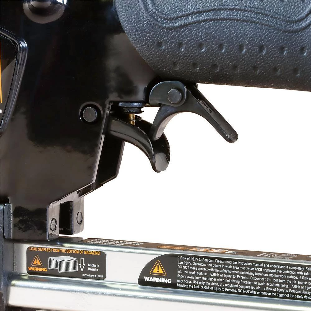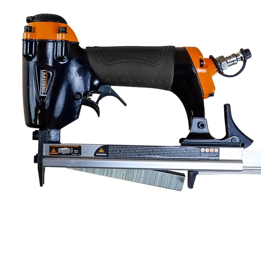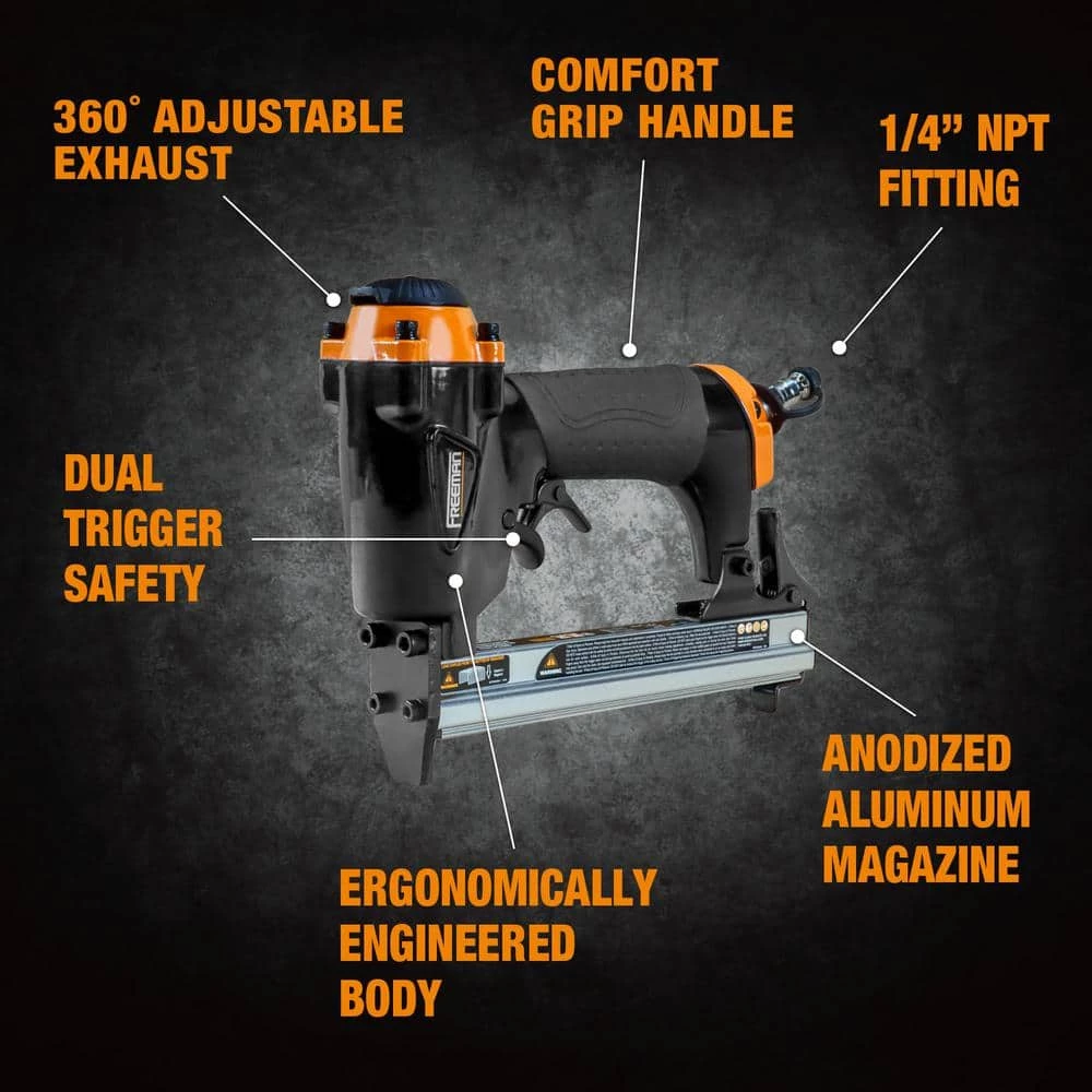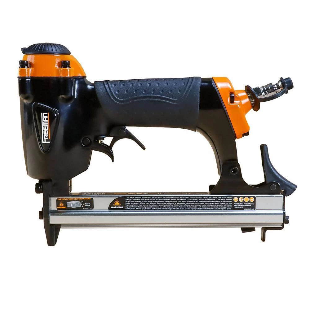 The Freeman P23LDS Pneumatic 23-Gauge Light Duty Stapler is perfect for jobs such as insulation, carpet padding, upholstery and fabric applications, poly sheeting, screen installation, and general repair work. The long-lasting anodized aluminum magazine of this air powered nail gun is fast and easy to reload. An ergonomically engineered body results in a rugged and lightweight tool great for long shifts, and a dual trigger safety protects the user and prevents accidental firing. Other features include a comfort grip handle to reduce fatigue and increase accuracy of fastener placement, along with 360° adjustable exhaust to direct air away from the face. The Pneumatic 23-Gauge Light Duty Stapler is ideal for DIYers tackling home improvement and repair projects as well as construction contractors at the jobsite, and is covered by Freeman’s 7-Year Limited Warranty and 90 Day Wearable Parts Warranty.