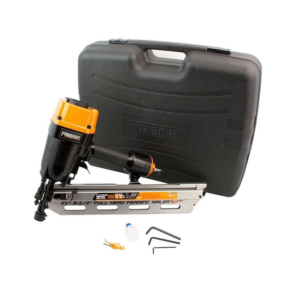 The Freeman PFR21CN65 Pneumatic 21° 3-1/2 in. Framing Nailer with Storage Case and Pneumatic 15° 2-1/2 in. Coil Siding Nailer Kit is an ideal pairing of tools for construction contractors as well as DIYers tackling home improvement and repair projects. Use the durable framing nailer for applications such as framing, subfloors, roof decking, pallet and shipping crate assembly and wood fencing. Put the rugged siding nailer to work on cedar shingles, roof and wall sheathing, siding and wood fencing. Both air powered nail guns are built to last and feature a magnesium body with a 1-piece drive blade. Each also has a tool-free depth adjust for various applications, a no mar tip to ensure professional results and a comfort grip handle to increase control while reducing fatigue during long shifts. The Pneumatic 21° 3-1/2 in. Framing Nailer with Storage Case and Pneumatic 15° 2-1/2 in. Coil Siding Nailer Kit will significantly increase your productivity around the house or at the job site and is covered by Freeman’s 7-Year Limited Warranty and 90-Day Wearable Parts Warranty.