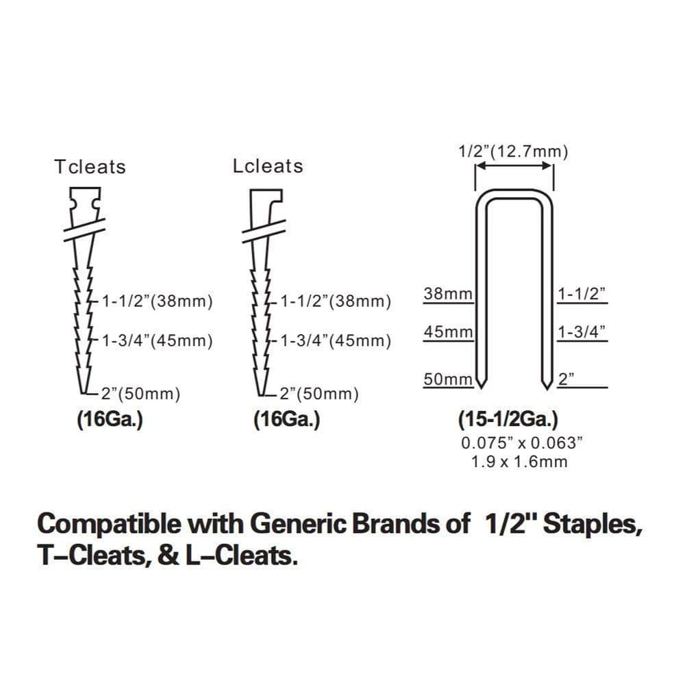 - 3-in-1 Flooring Nailer / Stapler: Multi-purpose design allows nailing and stapling with just one tool, saving time and money (16-Gauge T-cleats and L-cleats, and 15.5-Gauge 1/2 in. crown staples from 1-1/2 in. – 2 in. L for all three types of fasteners)