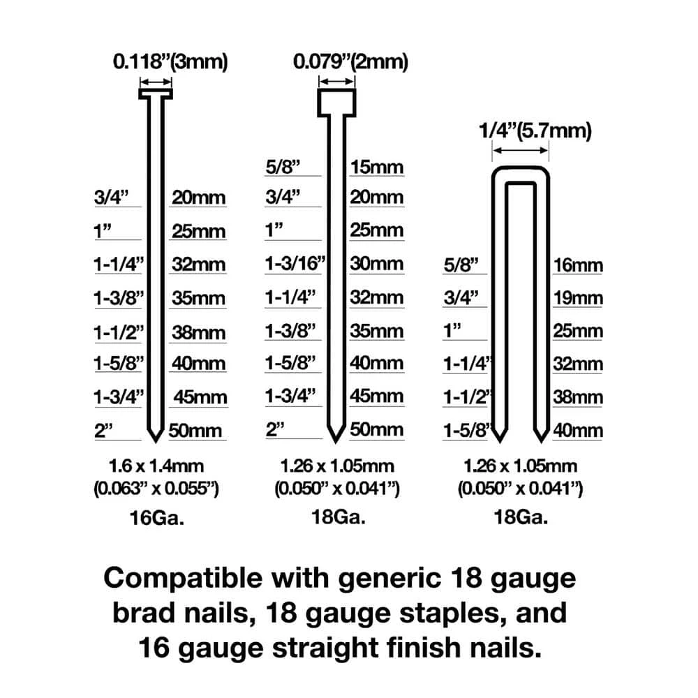 - 3-in-1 magazine is compatible with 16-Gauge finish nails from 3/4 in. to 2 in., 18-Gauge brad nails from 5/8 in. to 2 in. and 18-Gauge 1/4 in. narrow crown staples from 5/8 in. to 1-5/8 in.