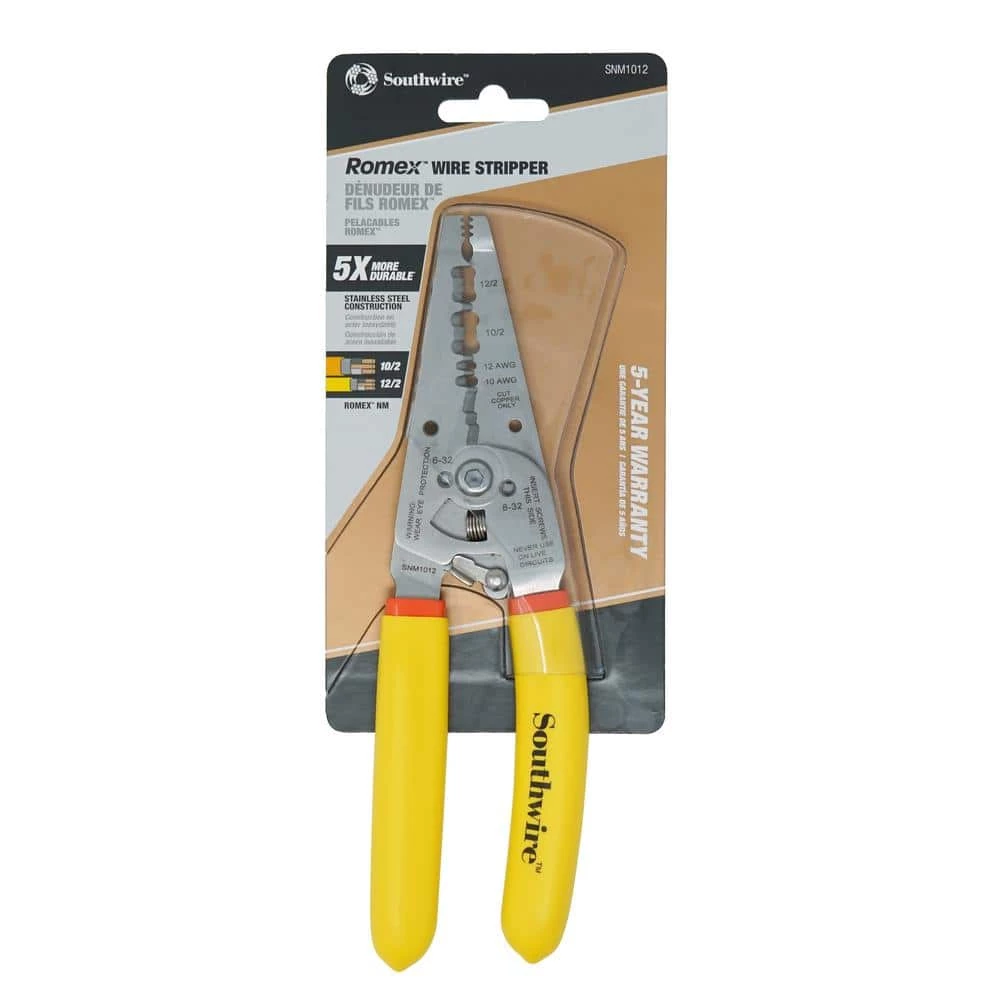 Our Romex SNM1012 cable strippers are designed to work with NM-B cable. These durable stainless steel wire strippers/cutters make removing the outer jacket quick and easy. With specially designed cutting blades and soft double-dipped grips provide for a comfortable, long-lasting tool.