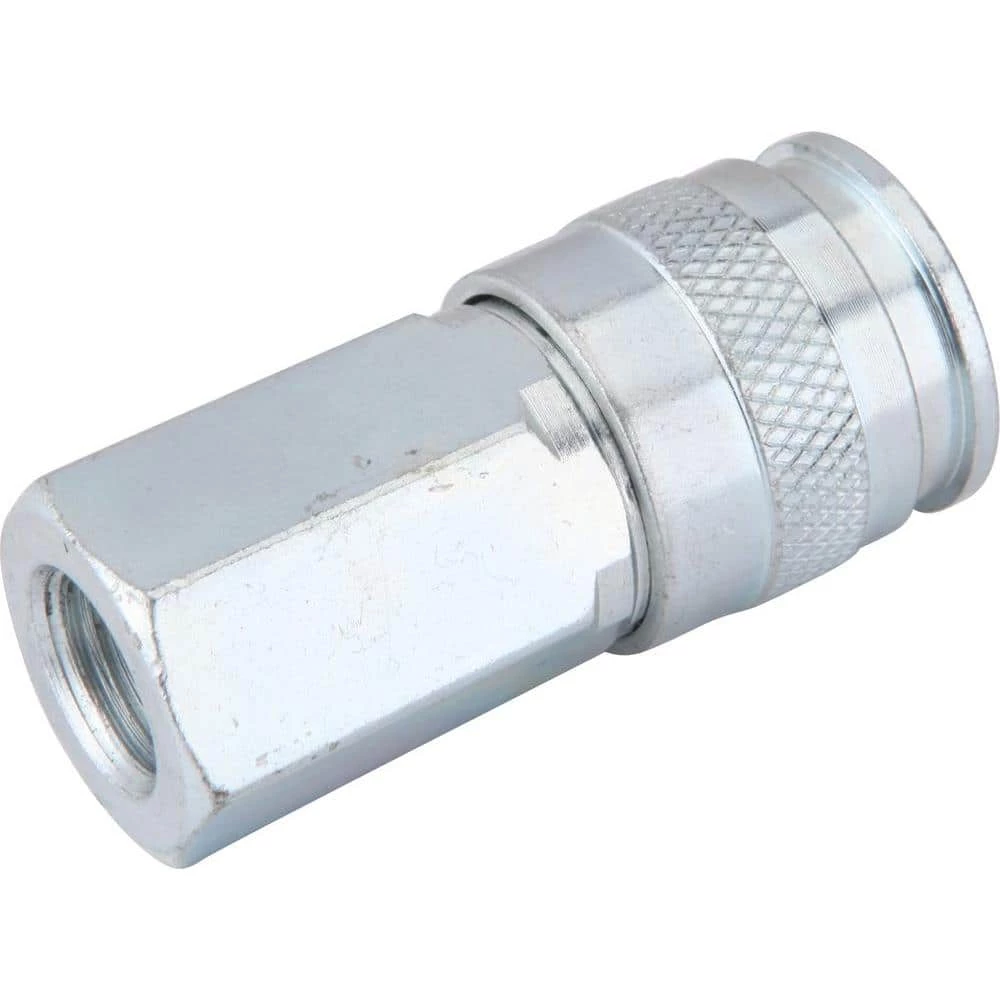 The Freeman Zinc 1/4 in. x 1/4 in. Female to Female Universal Coupler features a secure 4 ball connector for quick and secure connections. In-line valve keeps hose pressurized when disconnected and helps to reduce whip. Features a NPT 1/4 in. fitting along with a 1/4 in. snap-in style fitting for easy connections.